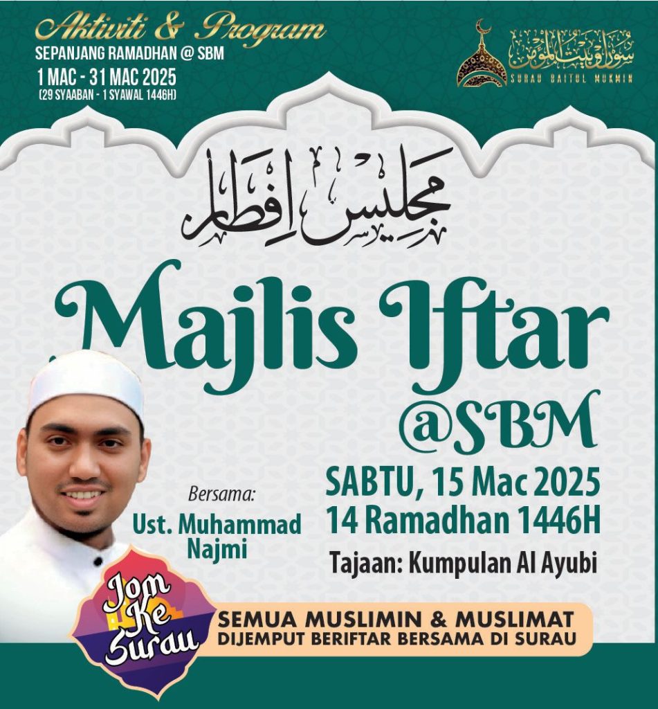 Sukacita dimaklumkan bahawa Surau Baitul Mukmin akan menganjurkan Majlis Iftar yang akan diadakan pada 15 Mac 2025 (14 Ramadhan 1446H).