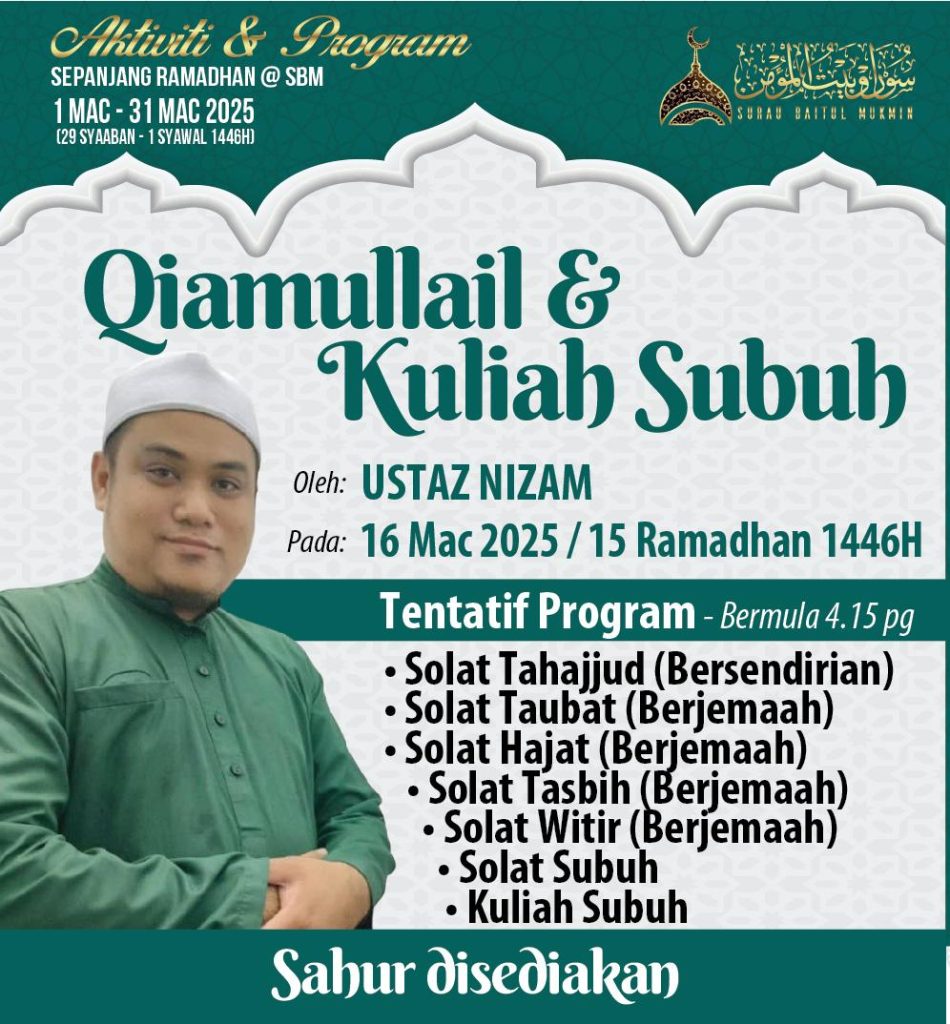 Insyaa Allah pada pagi esok (Ahad) akan diadakan Qiamullail dan Kuliah Subuh Khas Ramadhan bersama Ustaz Nizam.